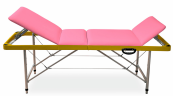 Складной трёхсекционный стол выполнен из экологичных материалов, имеет качественную обивку, которая легко очищается и по характеристикам превосходит даже натуральную кожу, позволяя столу сохранять былой вид даже через много лет, а крепкая конструкция выдержит высокую нагрузку до 200 кг. Это достижимо благодаря использованию при производстве рамы влагостойкой фанеры, а ножек — алюминия. При этом прочность и надежность конструкции выгодно отличают стол от аналогичных моделей. У данной модели есть возможность регулировать высоту от 650 до 900 мм с шагом в 50 мм. Мягкое покрытие стола выполнено из упругого полиуретана, который отлично принимает форму тела и не вызывает дискомфорта. Полиуретан покрыт высококачественной  искусственной кожи, неприхотливой в обслуживании, обладающей высокой износостойкостью и устойчивой к загрязнениям.